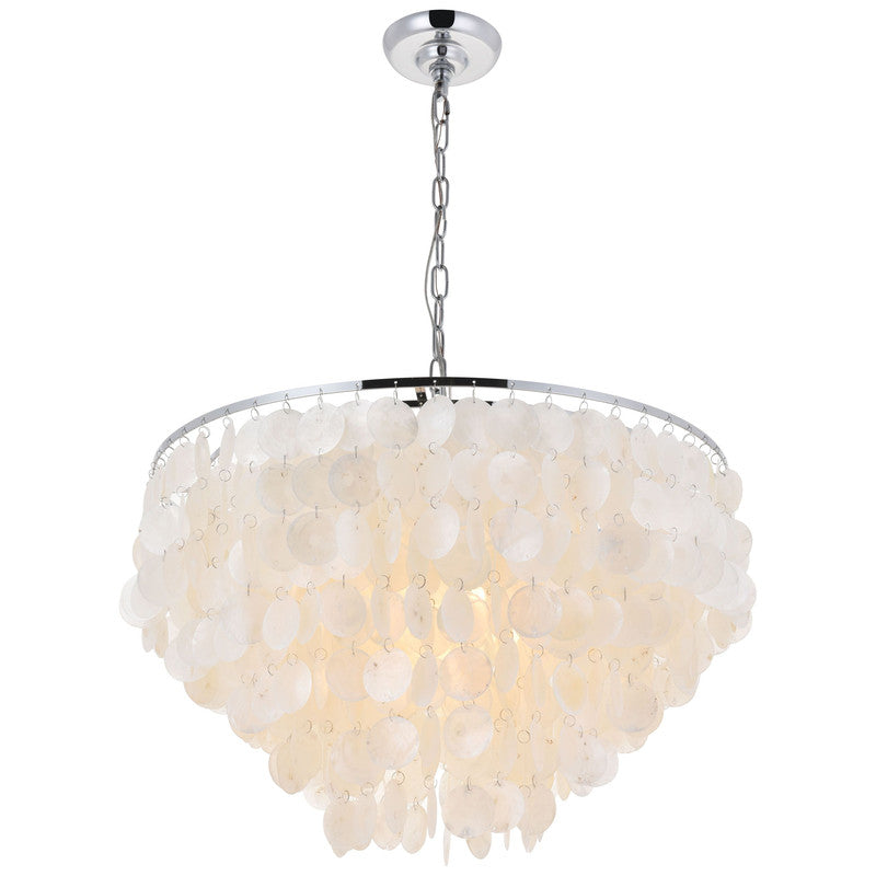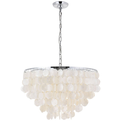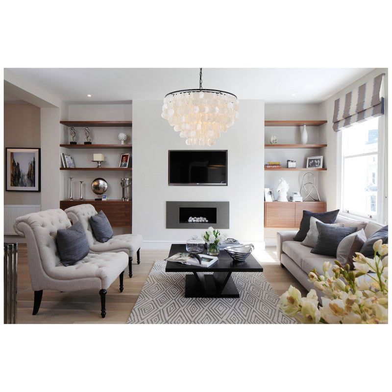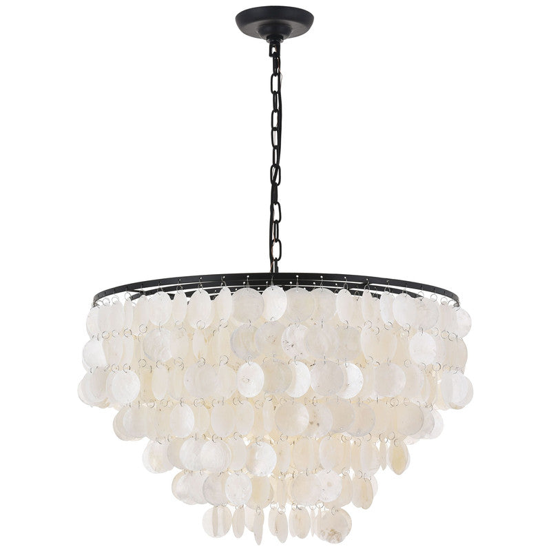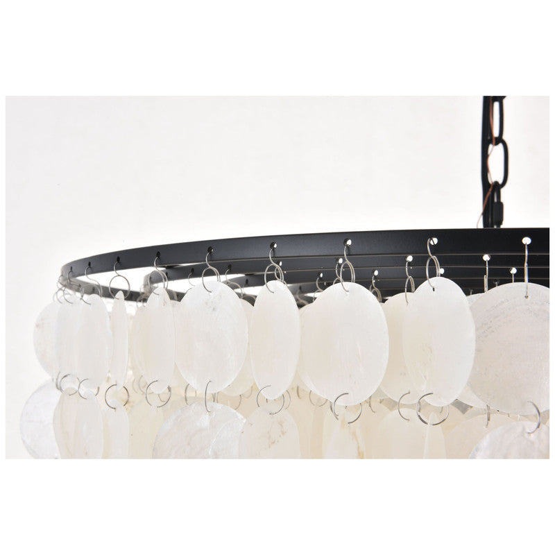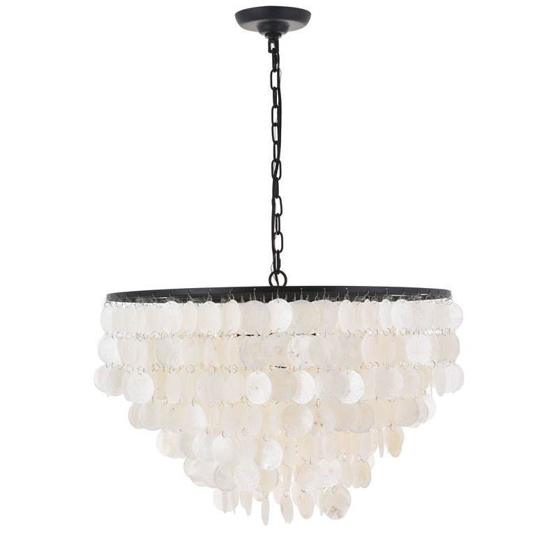 - Black finish pendant with dreamy off-white shells adorning the tiers