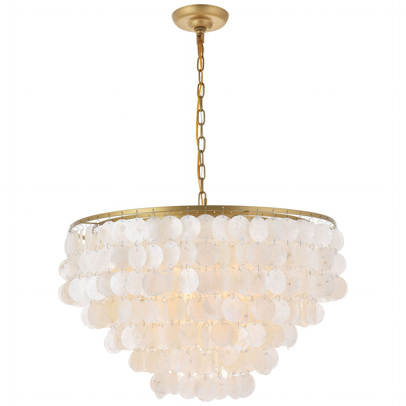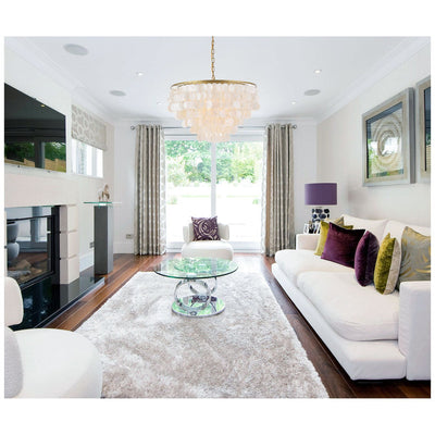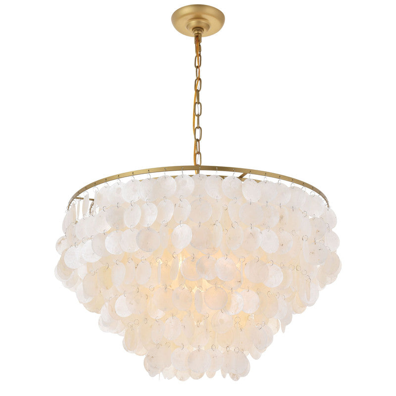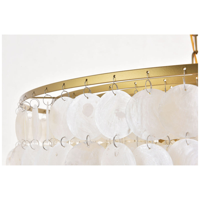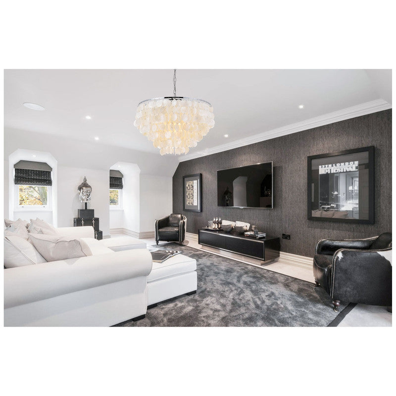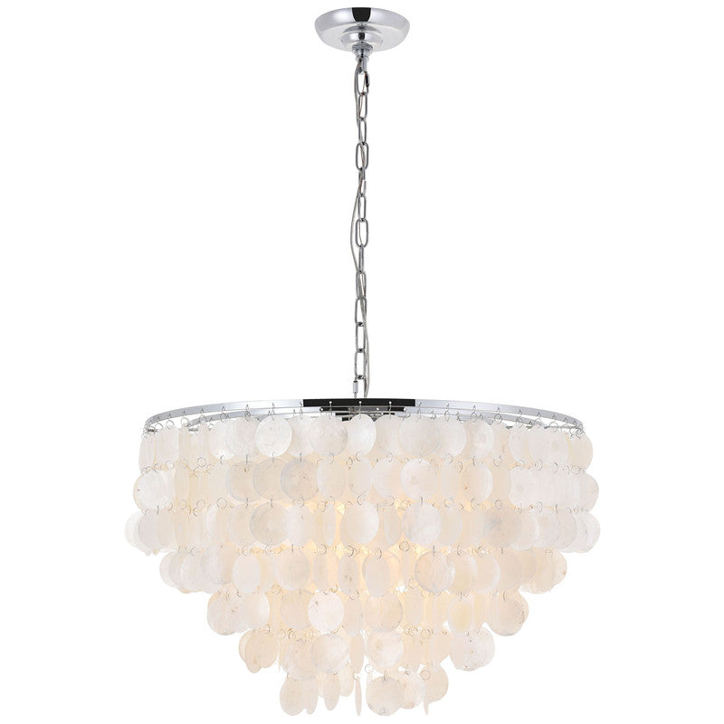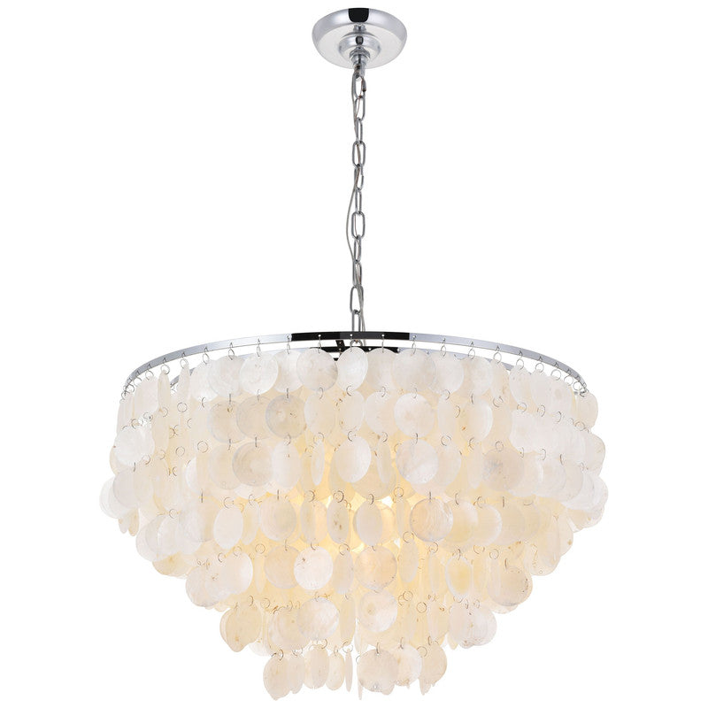 - Black finish pendant with dreamy off-white shells adorning the tiers