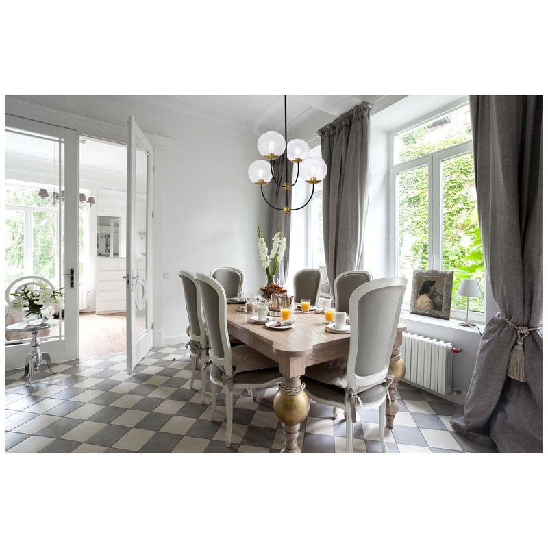 Add major mid-century modern style without taking up any valuable floor space with this 4-light chandelier. It's made from metal and features a slender shaped body that supports four rounded arms running parallel to the downrod. At each end of the arms there is a glass globe shade that diffuses the light from a 40W bulb (not included). This light arrives with an adjustable down rod.