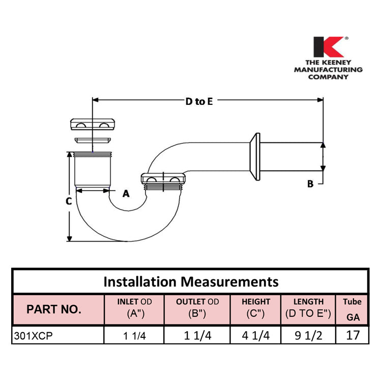 Keeney Manufacturer 301XCP - Brass p-trap, adjustable style without Cleanout Plug