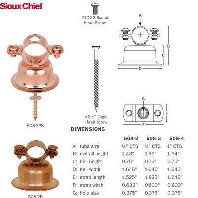 Sioux Chief 508 series copper plated bell hangers shall be used where necessary to support copper CTS in piping systems. Hanger shall be fastened directly to studs, joists or walls and secured with 2-1/2" mounting screw (provided). Bell hanger shall minimally provide a ¾" stand off distance from mounting surface. Hanger shall be copper-plated. Upper and lower pipe saddles of hanger shall fit 1/2", 3/4" or 1" CTS tube after screws are tightened. Upper pipe saddle may or may not have void in strap for easier installation.