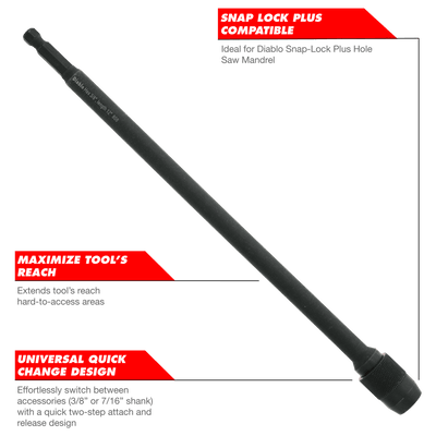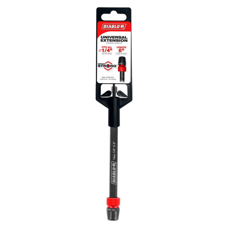 Diablo's Universal Extensions provide access in hard to reach areas by extending the length of your power tool accessory. A quick-change feature that requires no additional tools allows users to switch between accessories with no down time. This range of extensions is Impact Strong for increased shank stability and durability in cordless and corded impact and drill drivers.