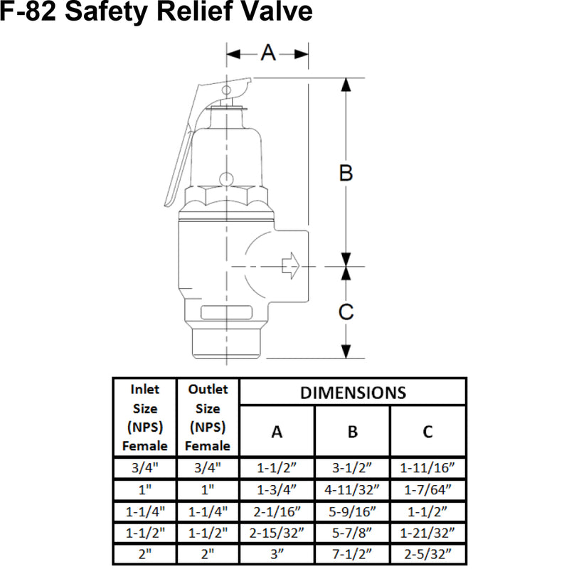 The Cash Acme F-82 Safety Relief Valves are designed for use on hot water service only and are not to be used on steam. The Cash Acme F-82 is available in 3/4", 1", 1-1/4", 1-1/2" and 2" sizes. All sizes have a female inlet and outlet. The 3/4" size is also available with a male inlet.