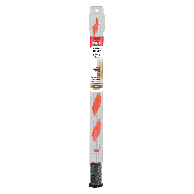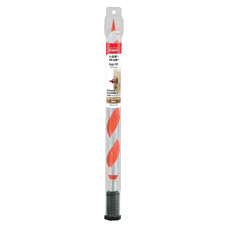 Diablo's Auger Bit range provides maximum performance, extreme durability and superior life in nail-embedded wood applications. A two-step cutting action creates holes that are precise and clean. The self-feeding Dura-Tip pulls the bit while the dual cutting edge delivers an effortless, smooth drilling experience in wood with nails. Deep flutes enhance the chip evacuation process for more holes per charge. Quick change shank increases stability and durability in cordless and corded impact wrenches and drill drivers.