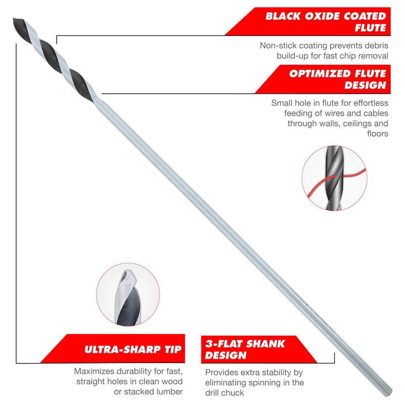 Diablo's Installer Drill Bits offer premium performance and superior life in wire installation projects. An ultra-sharp tip maximizes durability for fast, straight holes in clean wood or stacked lumber. Black oxide coated flutes prevent debris build-up for fast chip removal. The small hole in the flute makes feeding cables and wires effortless. The 3-Flat Shank provides extra stability by eliminating spinning in the drill chuck.
