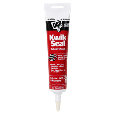 DAP KWIK SEAL Kitchen & Bath Adhesive Caulk is an easy-to-use, multi-purpose adhesive caulk ideal for caulking and sealing in the bathroom and kitchen. It bonds like a glue and seals like a caulk. It is specially formulated to provide a watertight seal around tubs, sinks, showers and countertops. Cured caulk is mold and mildew resistant. It offers excellent adhesion, flexibility and durability. It tools easily and dries tack free in 15 minutes. Excellent for areas subject to water contact and high humidity. Dried surface cleans easily and is paintable with either latex or oil-based paint. Resists cracking, crumbling and shrinking. Resists abrasive chemicals. Easy water clean-up.