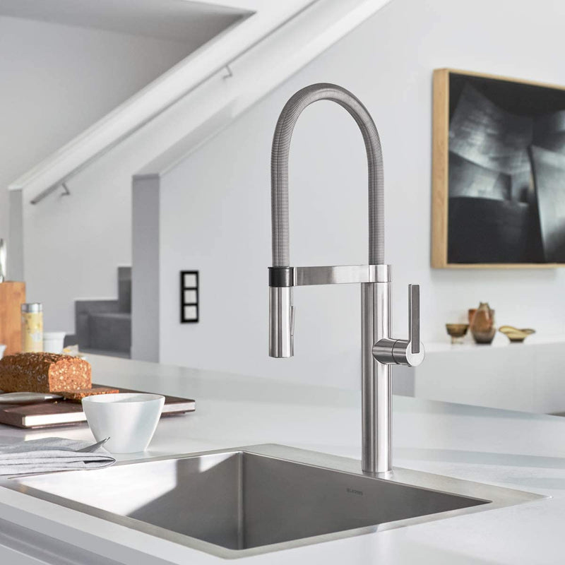 The kitchen is one of the most-used areas of the home. Blanco faucets for kitchen sinks are crafted for the way you live – from preparing your meals, to filling a cool glass of water, to washing the dirty dishes. Our Blanco Culina Semi-Professional dual-spray kitchen sink faucet combines high performance with high style – the tall, gooseneck faucet design features a high arc and sleek, streamlined metallic finish. Adding a professional look to your kitchen, these chef-style modern faucets offer the functionality and convenience most often used by expert chefs. Created from high-quality materials, the sink faucet with spray features a solid brass body construction for the ultimate durability and ceramic disc cartridges that protect your faucet from leaks. The pull out faucet spray has a metallic docking system to hold it firmly in position, and the sink faucet is finished with a sleek, flexible closed coil and streamlined handle inlay for the ultimate performance. The kitchen faucet’s single-handle does not move back behind the faucet, allowing for close backsplash installation. Fits perfectly. Performs incredibly.