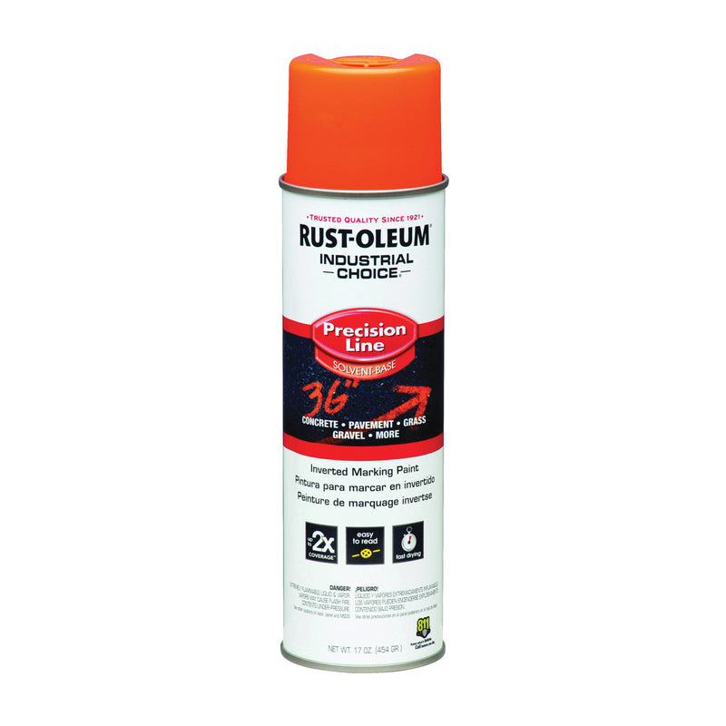 Rust-Oleum Industrial Choice M1600 System Precision Line Inverted Marking Paint is a solvent-based spray paint that creates crisp, accurate, easy-to-read and long-lasting markings in bright, durable colors. Precision Line is a general purpose inverted marking paint. Use for marking concrete, pavement, gravel, grass, and more. Precision Line is suitable for marking the location of underground utilities at construction and excavation sites where identification is desired.