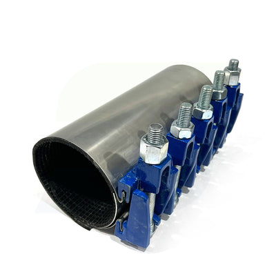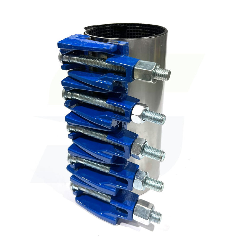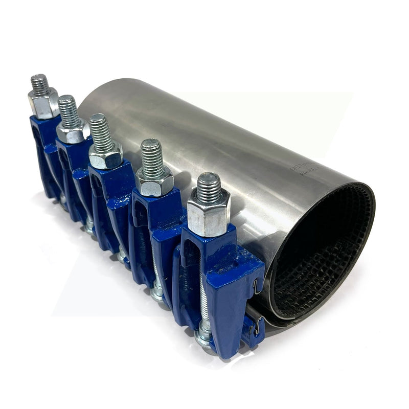 Smith-Blair Full Circle Repair Clamps consist of one or more stainless steel band sections to which cast or fabricated lugs are securely attached. The lugs accommodate bolts and nuts when mounting the clamp on pipe. Full Circle Repair Clamps have a full encirclement, tapered, overlapping, gridded gasket with a flush mounted, bonded, stainless steel bridge plate to span the band opening between the lugs. This provides a full circumferential seal on the pipe.