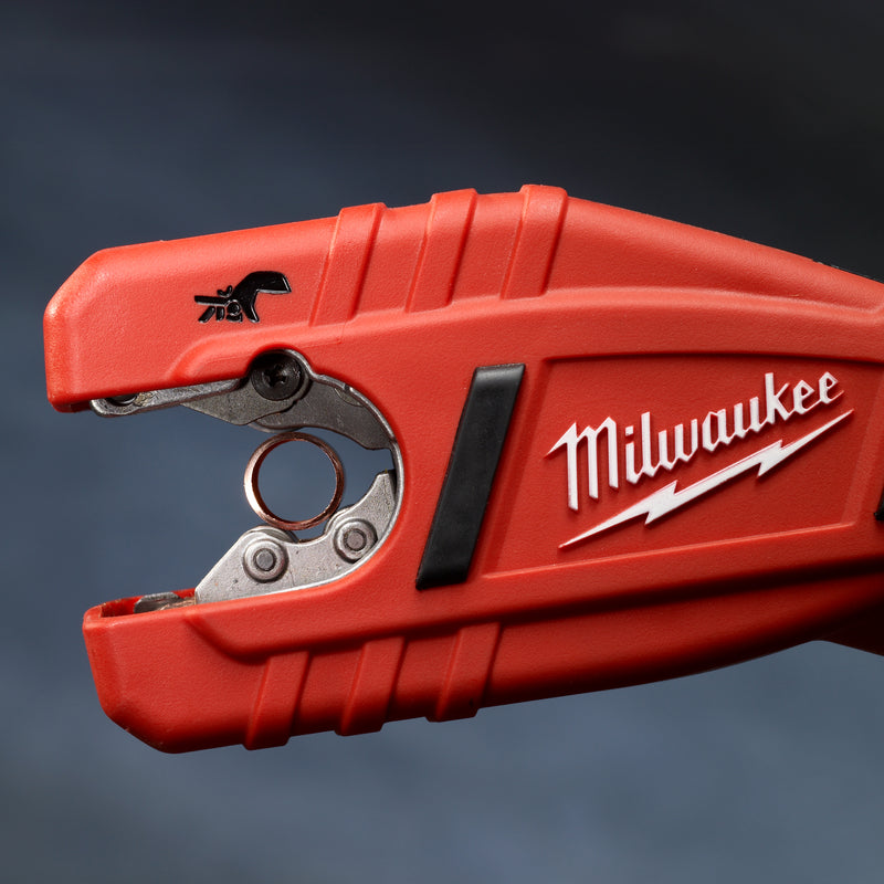 Milwaukee's M12 Copper Tubing Cutter Kit cuts up to 10X faster than conventional cutters and gives you up to 200 cuts on a single charge thanks to ultra-efficient gearing. As the industry’s first cordless lithium-ion powered copper pipe cutter, MILWAUKEE® engineered it with plumbers, mechanical contractors and remodelers in mind. The copper tubing cutter runs at 500 RPM for unmatched cutting speed and the patent-pending cutting mechanism automatically adjusts the diameter to cut Type K, L and M copper pipes from 3/8" to 1" (OD from ½" to 1-1/8"). This close quarters copper tubing cutter has a unique rotating cutting head that allows you to cut installed copper piping with as little as 1-1/2" clearance. The lightweight, handled pipe cutter inline design provides you with a longer reach, reducing wrist strain when working in confined spaces and has a built-in LED light that illuminates the cutting surface. The metal cutting head is corrosion and rust resistant, and sealed for water protection, while electronic overload protection and unibody construction provide additional durability. An onboard, real-time battery fuel gauge helps you monitor the charge precisely, so there’s less downtime on the job. In addition to the copper tubing cutter, this kit includes an M12 Lithium-Ion battery charger, an M12 REDLITHIUM CP1.5 battery pack and a carrying case.