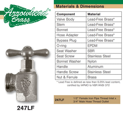 The Arrowhead Brass 247LF washing machine valve is nickel-plated has a 1/2" FIP connection. The 247LF includes Arrowhead Brass’s exclusive O-ring bonnet and stem design (no packaging nut to tighten) and a 3-year limited warranty.