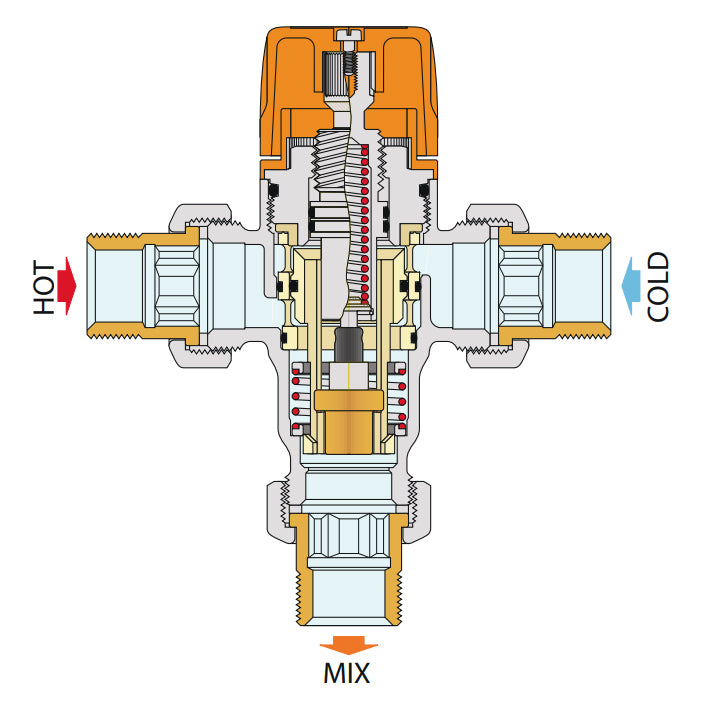 The thermostatic mixing valve is used in systems for scald protection in the production of domestic hot water. It is designed to maintain the set temperature of the mixed water supplied to the user when there are variations in the temperature and pressure conditions of the incoming hot and cold water or in the water’s flow rate. This particular series of mixing valves can function continuously at the high temperatures of the incoming hot water from the solar storage tank.