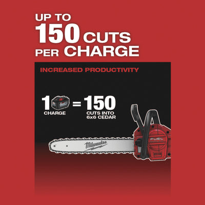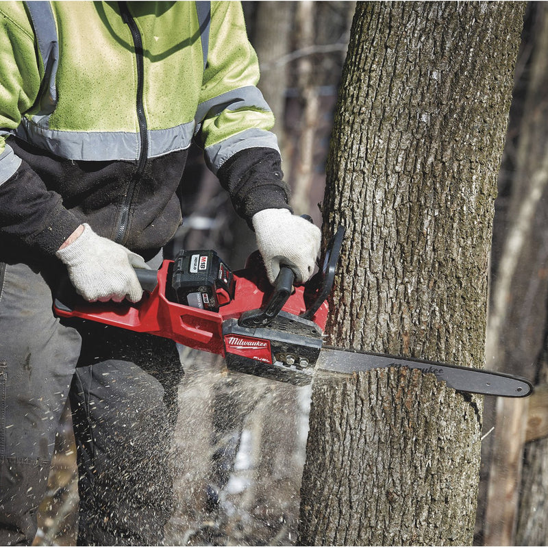 The Milwaukee M18 FUEL 16" Chainsaw delivers the power to cut hardwoods, cuts faster than gas, and delivers up to 150 cuts per charge. The unit is designed to meet the performance, durability and ergonomic needs of professional landscape maintenance, power utility, and the installed M18 user. The POWERSTATE Brushless Motor maintains speed under heavy loads without bogging down to outperform small gas engines and higher voltage systems. REDLINK PLUS intelligence ensures maximum performance and protection from overload, overheating and over discharge. The M18 REDLITHIUM High Output HD12.0 battery delivers unmatched run-time in all applications. M18 FUEL technology allows the unit to reach full throttle in under 1 second providing ultimate control and productivity.