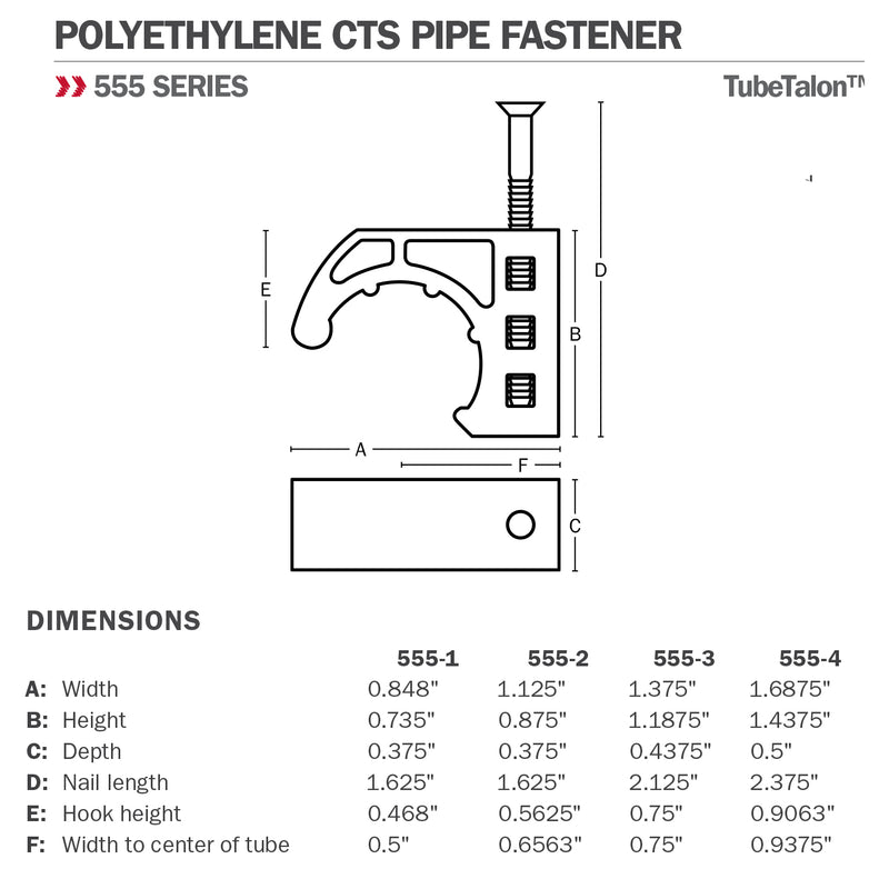 Sioux Chief 555 Series TubeTalon CTS pipe fasteners shall be used where necessary to secure CTS tube in piping systems. Fastener shall be 100% corrosion proof and U.V. resistant. Fastener shall be impact resistant to 0 degrees F, and able to withstand continuous temperatures up to 160 degrees F. Fastener shall have a preloaded nail, which shall be rust resistant. Nail shall have a continuous ring shank to provide a more permanent installation. Fastener shall snap onto CTS tube and allow for expansion and contraction. Fastener shall be designed to avoid tube damage if nail is overdriven.