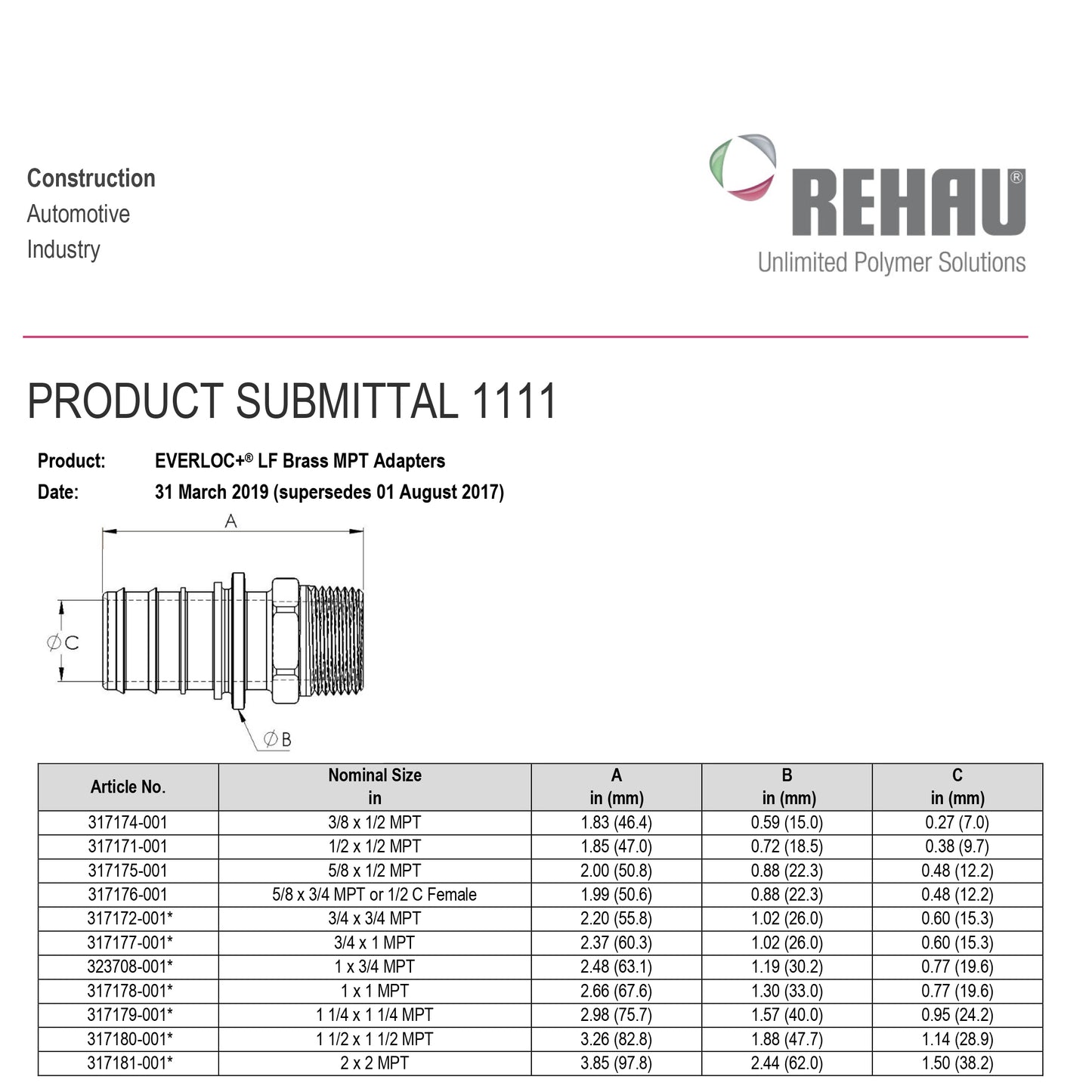 EVERLOC+ compression-sleeve fittings and sleeves are designed specifically for use with REHAU PEXa pipe. The maximum temperature and pressure ratings of the EVERLOC+ compression-sleeve fitting system is in accordance with ASTM F877 and CSA B137.5 for SDR9 PEX, see REHAU pipe product submittals for ratings. The common designations MPT (M=male) and FPT (F= female) refer to National Pipe Taper (NPT) threads in accordance with ANSI/ASME B1.20.1. Installation is performed with EVERLOC+ compression-sleeve tools. Follow all published REHAU Technical Guidelines. All EVERLOC+ fittings and sleeves comply with the lead-free (LF) requirements of the U.S. Safe Drinking Water Act.