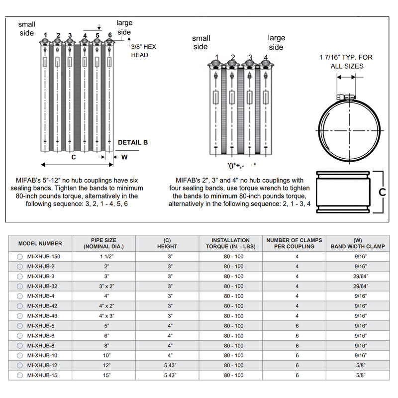 MIFAB Series MI-XHUB heavy duty shielded no hub couplings are manufactured with gaskets made from neoprene that meets the requirements of ASTM C-564 housed inside a Type 304 stainless steel corrugated shield. Four (2" through 4" size), six (5" through 15" size) Type 304 stainless steel clamps tightened with 3/8" Type 305 stainless steel hex head screws surround the shield to provide the sealing force. MI- XHUB Series Couplings are tested and certified to the ASTM-C1540-2015 and CSA B602-2016 Standards and are listed with IAPMO. The MI-XHUB are also tested and certified by Intertek Testing Services to the CAN/ULC S102.2-10 "Smoke Test". The MI-XHUB are tested by I.A.P.M.O. to comply to the FM 1680-1989 Standard (except for markings).
