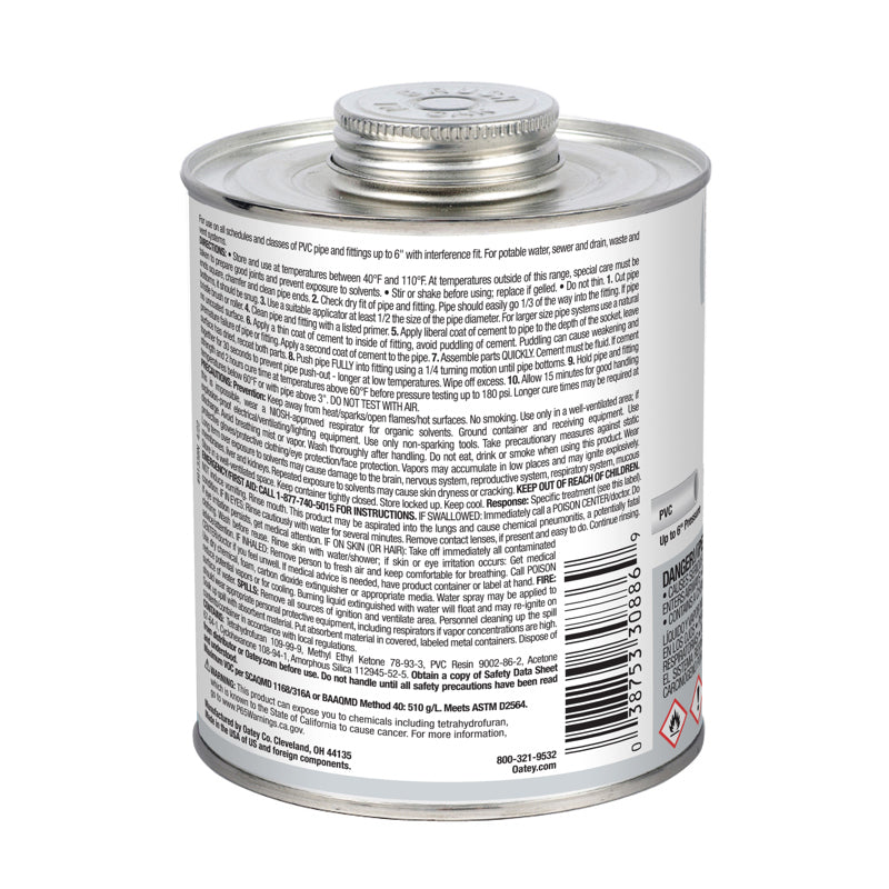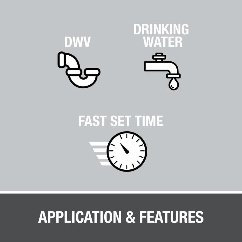 Oatey PVC Medium Gray Fast Set Cement is recommended for potable water, pressure pipe, conduit and DWV applications. It can be used on all schedules and classes of PVC pipe and fittings up to 6 in. diameter with interference fit. Oatey products have earned the trust of plumbing professionals for over 100 years.