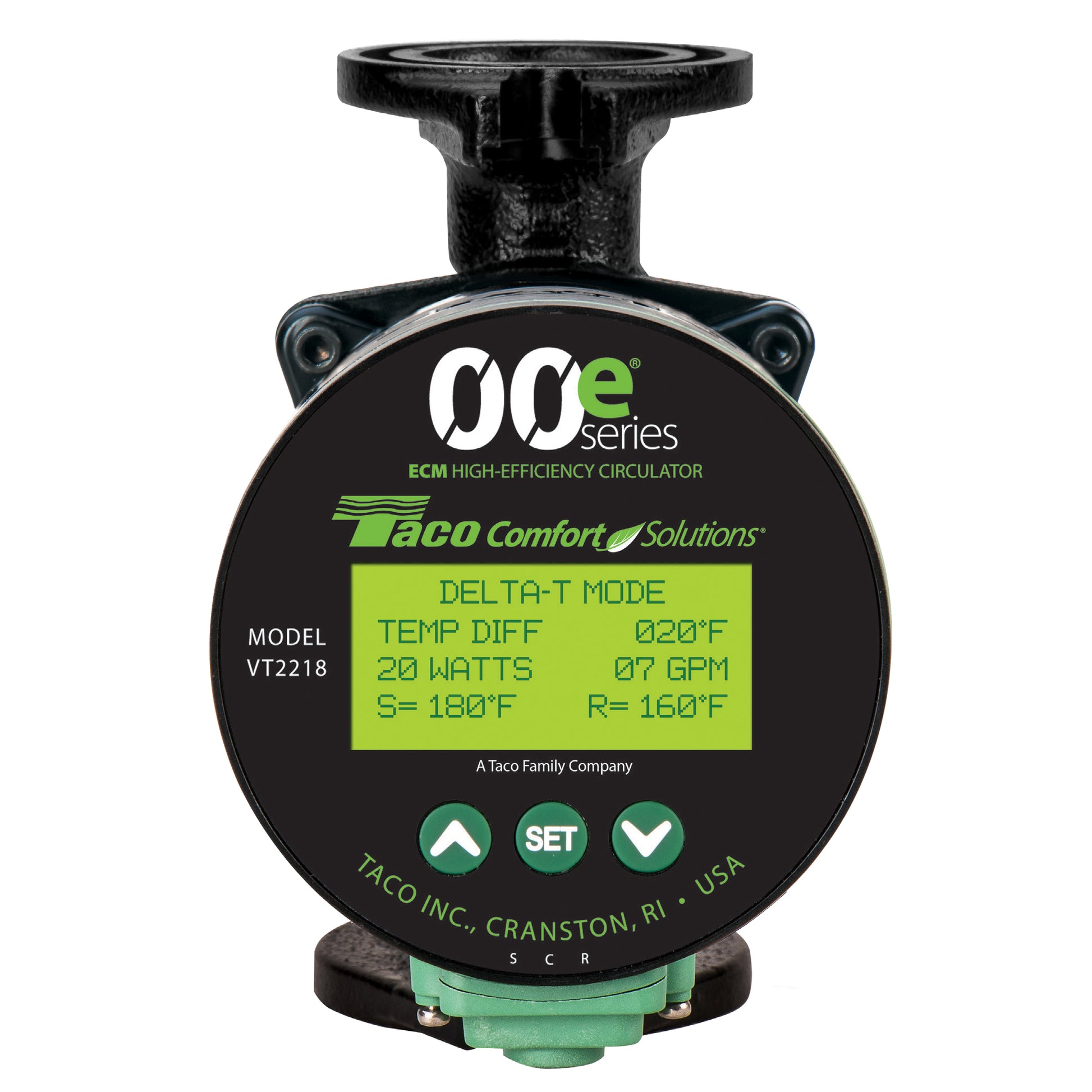 Taco 00e series — VT2218 Delta-T Variable Speed circulator is a temperature sensing, self-adjusting, variable speed, high-efficiency wet rotor circulator with an ECM permanent magnet motor. Operating modes include Delta-T differential temperature, 4 fixed speeds, set point heat, set point cool and boiler protection.
