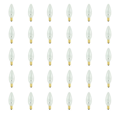 - Included in this purchase are thirty incandescent torpedo B10 chandelier light bulbs with E14 European screw base. Each bulb is 25 watts with a clear glass finish for a bright and clear lighting effect.