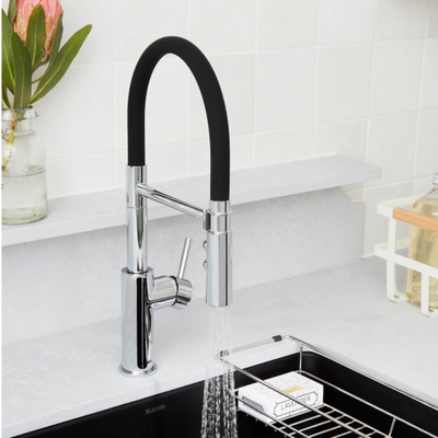 The CATRIS FLEXO offers a fresh take on the semi-professional faucet, combining functional elements and modern industrial flair. Designed to make cooking and cleaning more efficient than ever before, the CATRIS FLEXO boasts a 360-degree swivel for extended range of motion and a dual spray function to tackle everyday tasks from rinsing dishes to power washing dirty pots and pans. Its patented aerator significantly reduces limescale buildup, while its flexible, matte-black rubber hose provides a sleek, industrial look. The CATRIS FLEXO is built to deliver high performance for many years while providing long-lasting convenience. Easily pair your CATRIS FLEXO with your favorite BLANCO sink and accessories for a fully integrated BLANCO UNIT. With this setup, you'll have everything you need to drink, prep and clean all in one place.