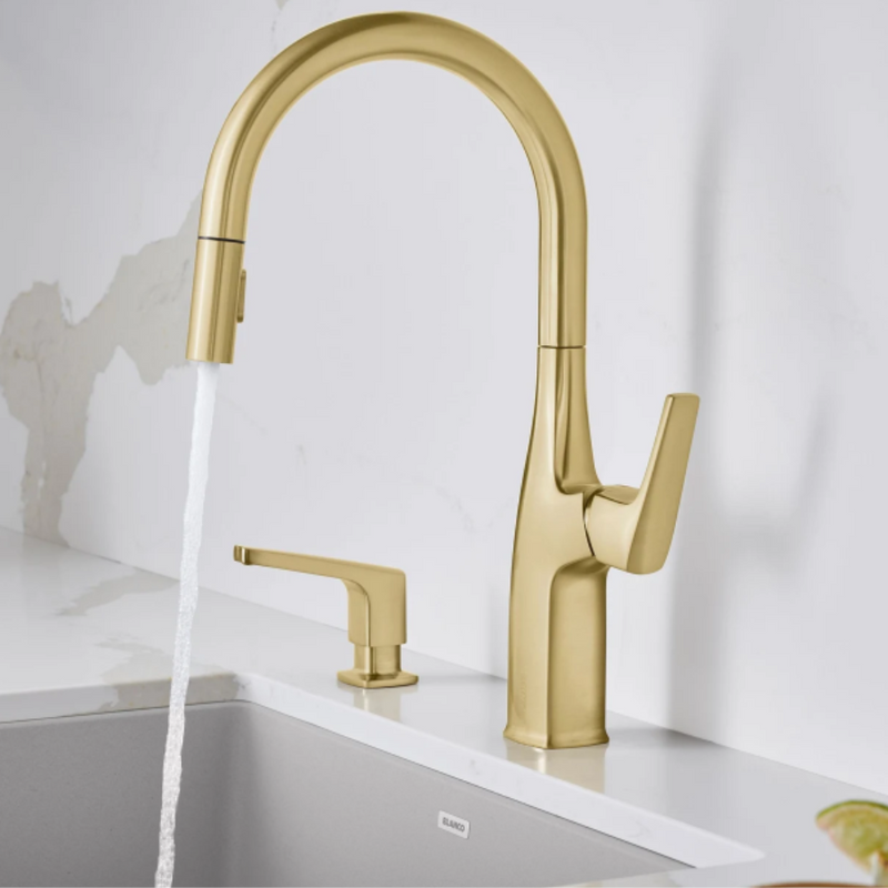 Where form and function unite. The BLANCO RIVANA HIGH-ARC KITCHEN FAUCET delivers powerful performance with sleek design aesthetics. A clean, square design at the faucet base transitions into a rounded spout, blending organic shapes with ergonomic function. The BLANCO RIVANA features a concealed spray-head for a streamlined, modern design. Featuring an insulated hand spray with a dual-spray button, easily toggle between a solid stream or wide spray.
