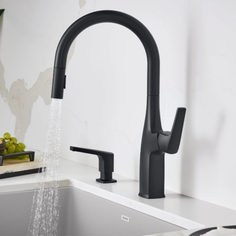 Where form and function unite. The BLANCO RIVANA HIGH-ARC KITCHEN FAUCET delivers powerful performance with sleek design aesthetics. A clean, square design at the faucet base transitions into a rounded spout, blending organic shapes with ergonomic function. The BLANCO RIVANA features a concealed spray-head for a streamlined, modern design. Featuring an insulated hand spray with a dual-spray button, easily toggle between a solid stream or wide spray.