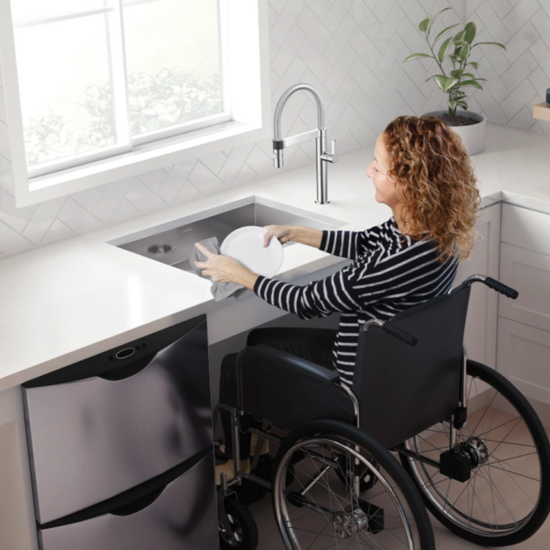 Everyday convenience meets modern design. The QUATRUS R0 ADA Undermount Stainless Steel Kitchen Sink features a reduced bowl depth for wheelchair accessibility and a rear-positioned drain hole, which help provide knee clearance when the sink is used from a seated position. German-engineered with corrosion-resistant stainless steel for long-lasting durability and zero radius corners for a modern look —the QUATRUS R0 ADA sink makes kitchen life easy. Combine the QUATRUS R0 ADA sink with a BLANCO faucet and accessories to create a BLANCO UNIT; a seamless, fully integrated kitchen solution designed to maximize independence and maneuverability. Everything you need to drink, prep and clean, all in one place.