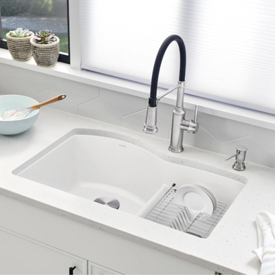 The DIAMOND 60/40 DOUBLE BOWL UNDERMOUNT KITCHEN SINK with LOW DIVIDE features a 60/40 bowl design with low partition, offering plenty of room for rinsing, washing, soaking, spraying and straining operations. The 60/40 bowl split allows for washing larger items while still leaving the smaller bowl open and the convenient low divide sits just 5-1/2" from the sink bottom, making it easier to handle large pots and baking sheets. Made of SILGRANIT, DIAMOND kitchen sinks are engineered to withstand heavy cookware and hot bakeware. Silgranit sinks are not only strong but also beautiful, available in a range of nature-inspired colors that effortlessly complement the latest kitchen trends. Combine the DIAMOND sink with a BLANCO faucet and accessories to create a BLANCO UNIT; a seamlessly integrated kitchen solution designed to transform kitchen chores into joyful experiences. Everything you need to drink, prep and clean, all in one place.