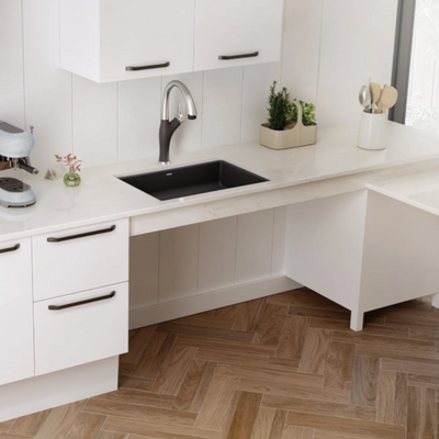 The PRECIS 25” SINGLE BOWL ADA KITCHEN SINK offers clean lines and a simple but spacious single bowl design. This ADA-compliant kitchen sink features a reduced bowl depth for wheelchair accessibility and a rear-positioned drain hole, which helps provide knee clearance when the sink is used from a seated position. Made of SILGRANIT, PRECIS kitchen sinks are engineered to withstand heavy cookware and hot bakeware. Silgranit sinks are not only strong but also beautiful, available in a range of nature-inspired colors that effortlessly complement the latest kitchen trends. Combine the PRECIS sink with a BLANCO faucet and accessories to create a BLANCO UNIT; a seamlessly integrated kitchen solution designed to transform kitchen chores into joyful experiences. Everything you need to drink, prep and clean, all in one place.