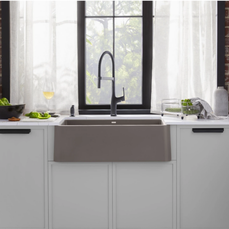 The IKON farmhouse sink is a fresh take on the classic farmhouse style. The kitchen sink’s slightly angled apron-front design adds architectural detail and comes in a range of nature-inspired colors that complement the latest kitchen trends. BLANCO’s IKON 30” sink features a spacious single bowl for easy washing of large pots and pans. Made of BLANCO’s patented SILGRANIT composite material, IKON sinks are engineered to withstand heavy cookware and hot bakeware. Combine the IKON 30” sink with a BLANCO faucet and accessories to create a BLANCO UNIT; a seamless, fully integrated kitchen solution designed to transform kitchen chores into joyful experiences.