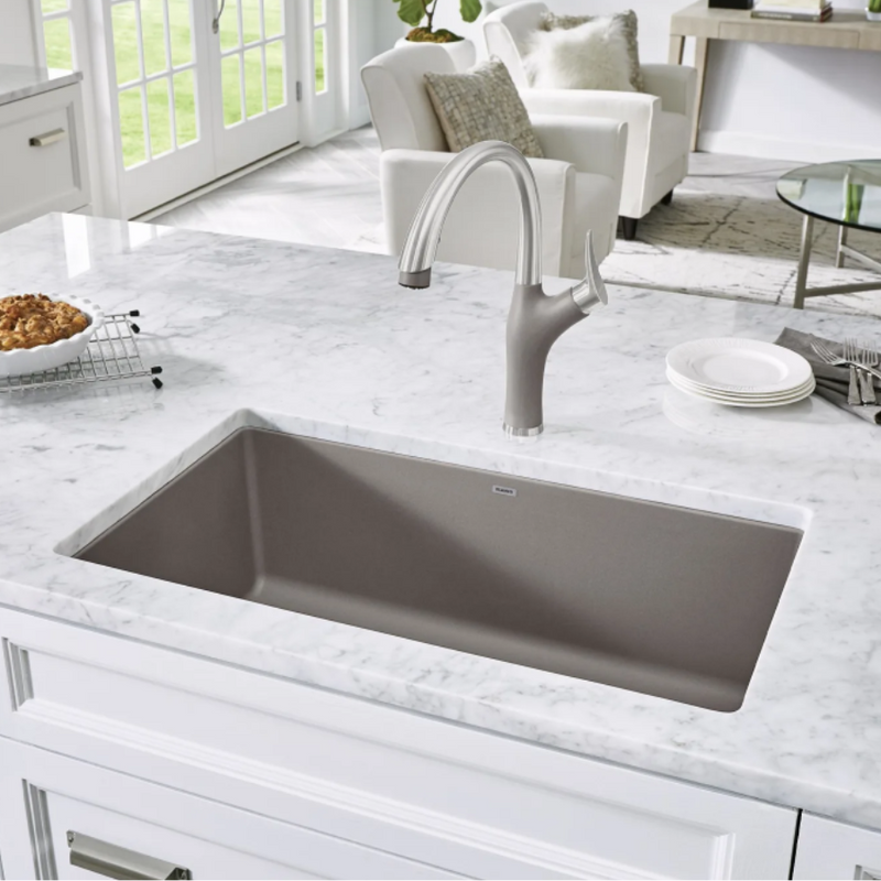 The PRECIS SUPER SINGLE UNDERMOUNT KITCHEN SINK offers clean lines and a spacious single bowl design. One of BLANCO's most popular sinks, the PRECIS SUPER SINGLE features an extra-large bowl, so kitchen items such as baking sheets, pots and pans can be easily maneuvered. Made of SILGRANIT, PRECIS kitchen sinks are engineered to withstand heavy cookware and hot bakeware. Silgranit sinks are not only strong but also beautiful, available in a range of nature-inspired colors that effortlessly complement the latest kitchen trends. Combine the PRECIS sink with a BLANCO faucet and accessories to create a BLANCO UNIT; a seamlessly integrated kitchen solution designed to transform kitchen chores into joyful experiences. Everything you need to drink, prep and clean, all in one place.