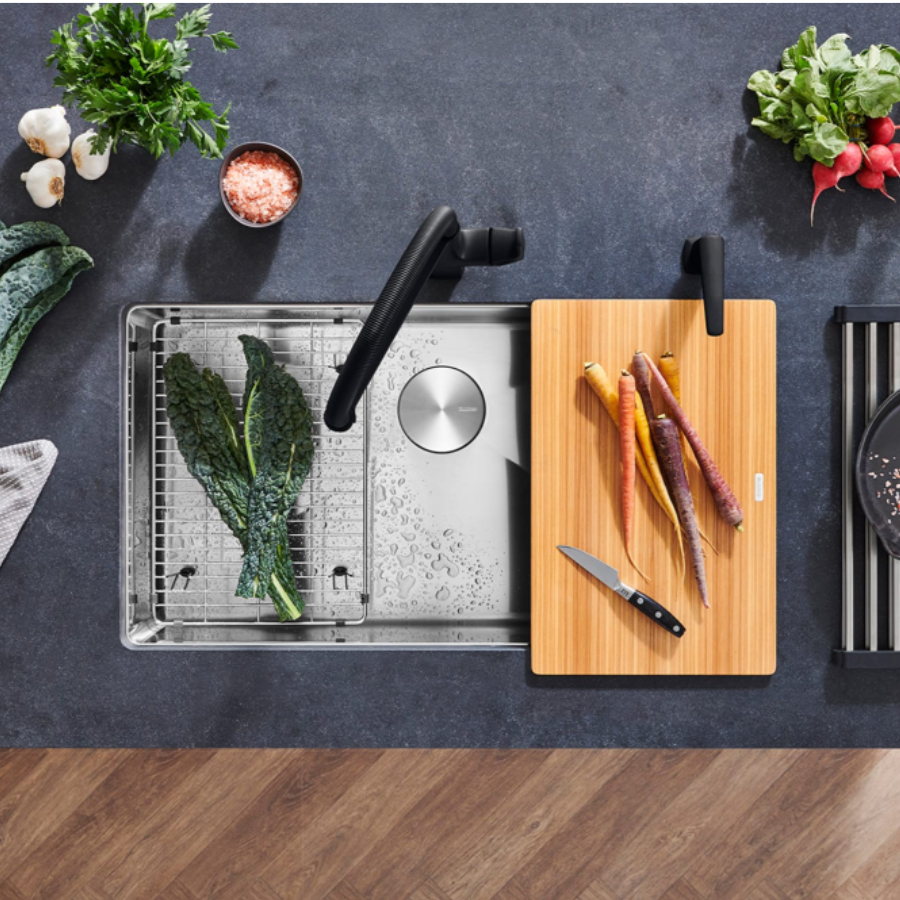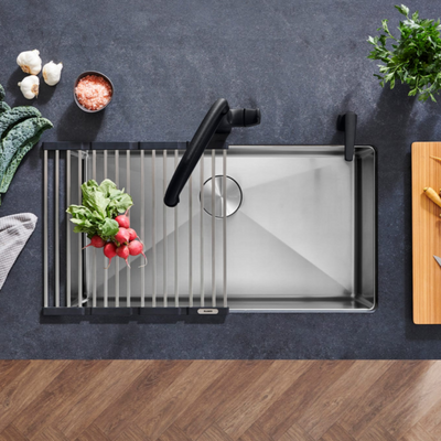 Everyday convenience meets modern design. The QUATRUS R15 32" Single Bowl Undermount Stainless Steel Kitchen Sink is ideal for busy kitchens thanks to its spacious single bowl configuration that allows for easy washing of large pots and pans. German-engineered with corrosion-resistant stainless steel for long-lasting durability and 15 mm radius corners for low-maintenance cleaning —the QUATRUS R15 32" sink makes kitchen life easy. Combine the QUATRUS R15 32" sink with a BLANCO faucet and accessories to create a BLANCO UNIT; a seamless, fully integrated kitchen solution designed to transform kitchen chores into joyful experiences. Everything you need to drink, prep and clean, all in one place.