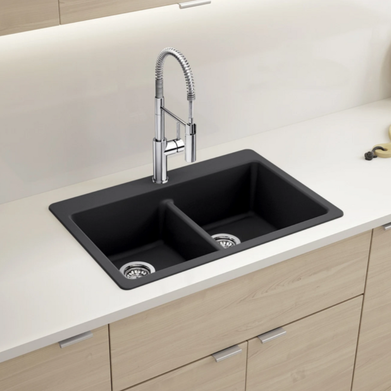 Every space deserves to be beautiful. BLANCO’s LIVEN 33" 50/50 double bowl kitchen sink is ideal for multitasking, with a convenient double bowl configuration that allows you to soak dishes in one bowl while rinsing in the other. The convenient low divide makes maneuvering large pots and pans a breeze. Made of SILGRANIT, LIVEN kitchen sinks are engineered to withstand heavy cookware and hot bakeware. SILGRANIT sinks are not only strong but also beautiful, available in a range of nature-inspired colors that effortlessly complement the latest kitchen trends. Combine the LIVEN double bowl sink with a BLANCO faucet and accessories to create a BLANCO UNIT; a seamlessly integrated kitchen solution designed to transform kitchen chores into joyful experiences. Everything you need to drink, prep and clean, all in one place.