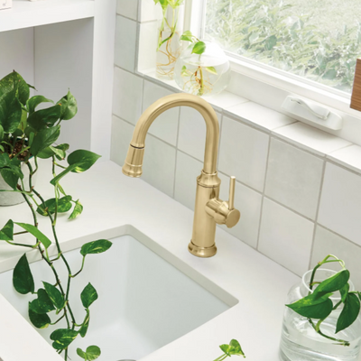 Two worlds collide with the EMPRESSA PULL-DOWN BAR FAUCET - modern features with traditional, old-world detailing. Inspired by German wine country, the EMPRESSA BAR FAUCET is modeled after the shape of vintage wine presses found across Europe. Characterized by signature details such as vintage wine press-inspired handles and an integrated pull-down single-function spray, the EMPRESSA is the perfect example of classic European design infused with modern features and functionality. The EMPRESSA can be easily installed in kitchen islands, wet/dry bars, or smaller kitchens with less clearance space.