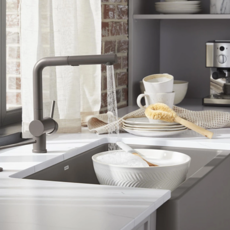 Two worlds collide with the EMPRESSA PULL-DOWN BAR FAUCET - modern features with traditional, old-world detailing. Inspired by German wine country, the EMPRESSA BAR FAUCET is modeled after the shape of vintage wine presses found across Europe. Characterized by signature details such as vintage wine press-inspired handles and an integrated pull-down single-function spray, the EMPRESSA is the perfect example of classic European design infused with modern features and functionality. The EMPRESSA can be easily installed in kitchen islands, wet/dry bars, or smaller kitchens with less clearance space.