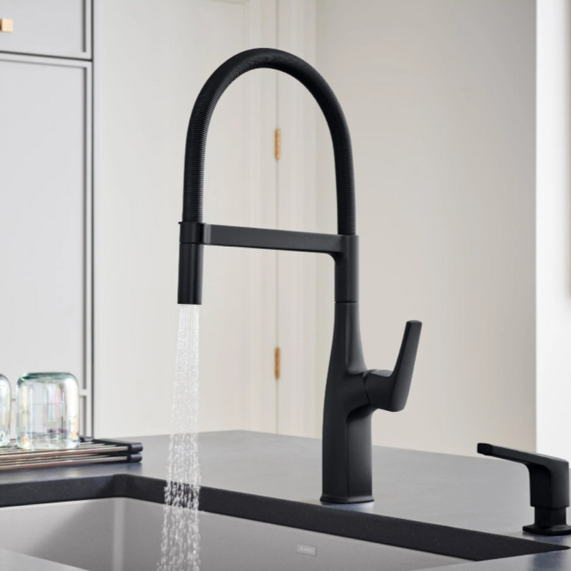 Where form and function unite. Inspired by faucets used in professional kitchens, BLANCO is the originator of the closed coil design and combines industrial style with modern appeal. The BLANCO RIVANA SEMI-PROFESSIONAL KITCHEN FAUCET delivers powerful performance with sleek design aesthetics. A clean, square design at the faucet base transitions into a rounded spout, blending organic shapes with ergonomic function. The BLANCO RIVANA provides home chefs with the ultimate in luxury and performance.