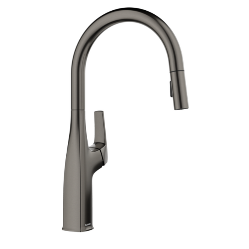 Where form and function unite. The BLANCO RIVANA HIGH-ARC KITCHEN FAUCET delivers powerful performance with sleek design aesthetics. A clean, square design at the faucet base transitions into a rounded spout, blending organic shapes with ergonomic function. The BLANCO RIVANA features a concealed spray-head for a streamlined, modern design. Featuring an insulated hand spray with a dual-spray button, easily toggle between a solid stream or wide spray.