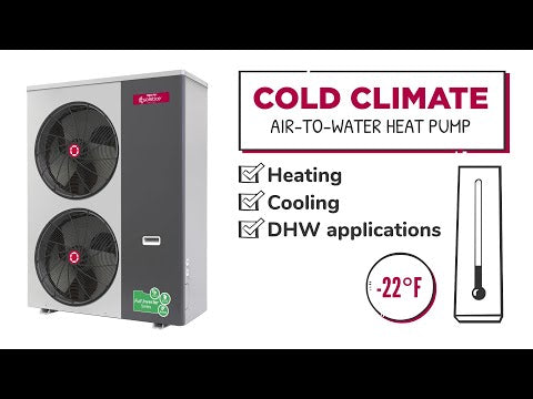 The SIS-060 Air-to-Water Heat Pump uses Inverter technology to precisely match the heating or cooling load. It contains an Enhanced Vapor Injection compressor for maximum performance in extreme heating conditions, and is installed in a split configuration, keeping all water and plumbing indoors, with only the compressor, fan and airside heat exchanger located outdoors.