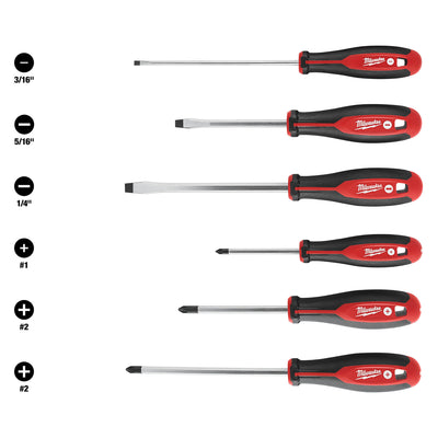 Milwaukee's 6-Piece Screwdriver kit features hardened tips and forged shanks, providing you with professional grade solutions and durability. Each screwdriver's bit type is marked on the tool's cap, allowing you to quickly identify them for increased efficiency. The comfortable tri-lobe handles allow you to comfortably apply more leverage while using the screwdrivers and magnetic tips help you hold screws in place while driving. Each screwdriver in the set is backed by our MILWAUKEE Limited Lifetime Warranty