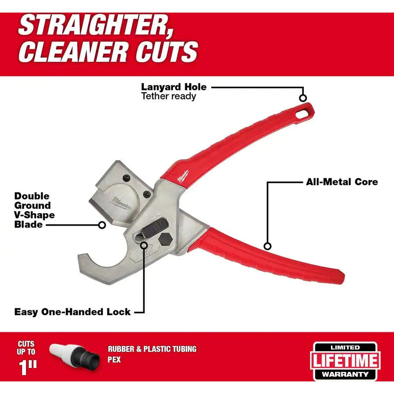 Milwaukee's Tubing Cutter offers you straighter, cleaner cuts. It features a replaceable V-shaped, double ground steel blade for clean perpendicular cuts and maximum tool life. The one-handed locking mechanism is designed for an easy-to-use lock for improved tool safety. This MILWAUKEE Tubing Cutter has an all-metal core for added durability on the jobsite. The Tubing Cutter has a 1" capacity for rubber, plastic, and PEX Tubing. It is for use with the Milwaukee Tubing Cutter Blade (48-22-4203). The tubing cutter tool is backed by Milwaukee's Limited Lifetime Warranty.