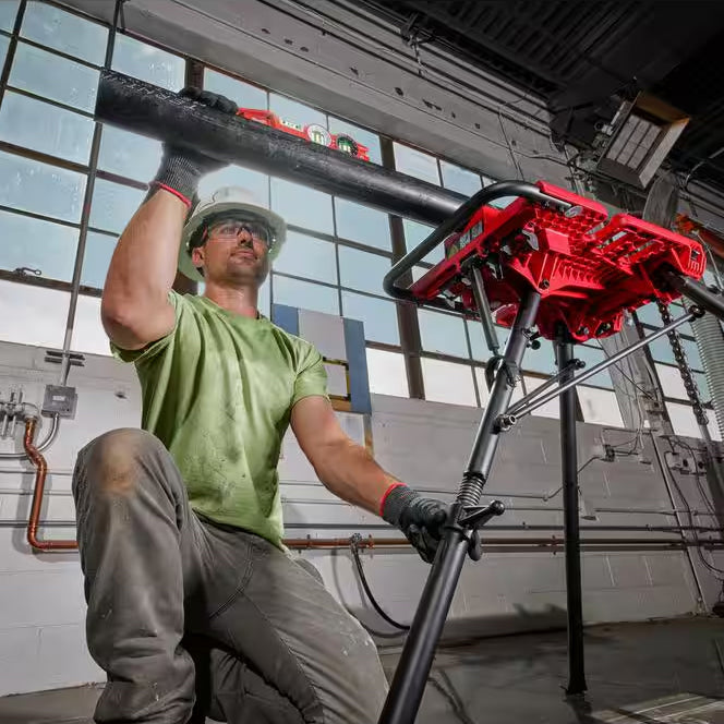 Milwaukee's 6" Leveling Tripod Chain Vise delivers unmatched portability and lifelong steadiness for mechanical, electrical, and plumbing tradesmen working with pipe, conduit, and other materials. Its flat-folding design and balanced carry handle enable briefcase-style transportation and compact storage in job boxes and service vans. Our simple two-step deployment eliminates setup hassles delivering the quickest, painless setup. Equipped with MILWAUKEE® STABLE LOK, contractors can easily adjust the tension to steady the deck throughout life, providing lifetime sturdiness. Featuring an adjustable leg for level alignments, you can pitch the deck +/- 3 degrees to level work materials and build systems to a pitch. With an expansive work surface, dedicated tool storage, and multi-material chain vise, this pipe stand tripod serves as a portable work desk for all tradesmen installing pipe, conduit, and other materials.