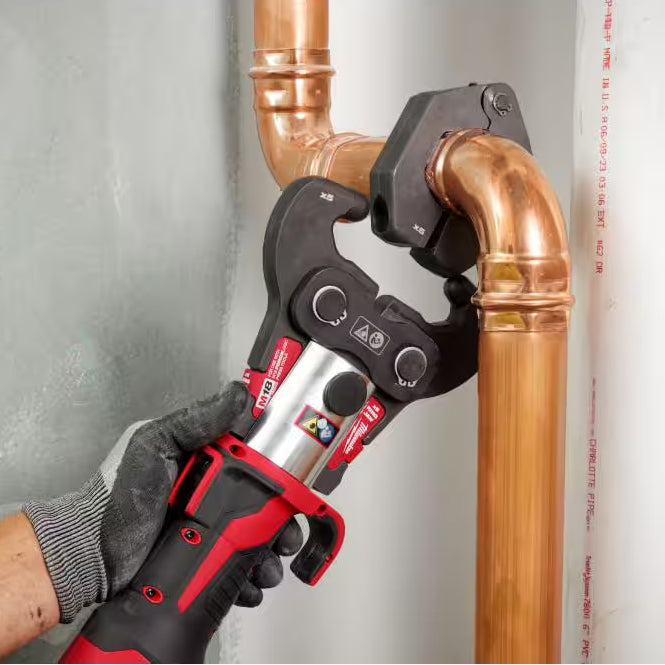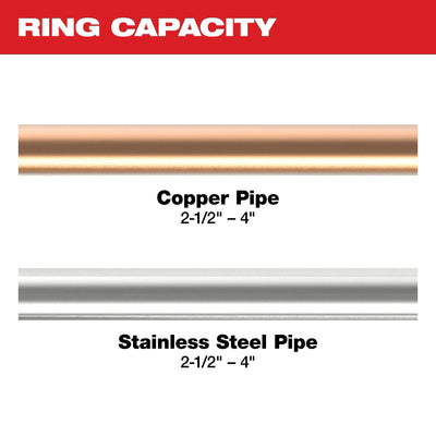 Milwaukee's 2-1/2" – 4” CTS-V Pivoting Press Ring Kit is designed for use with M18 FORCE LOGIC Press Tools on Viega ProPress, Apollo Press and other press fitting systems. The CTS-V Pivoting Press Ring Kit is a more efficient alternative to sweat and solder, enabling you to press connections on 2-1/2" – 4” copper and copper tube-sized (CTS) stainless steel pipe. Pivoting functionality delivers greater access in tight spaces when paired with the X5 Ring Jaw & M18 FORCE LOGIC Press Tools. Additionally, MILWAUKEE's press blocking system prevents improper ring and ring jaw mismatch providing peace of mind in quality connections. The 2-1/2" – 4” CTS-V Pivoting Press Ring Kit, combined with the ring jaw and in-line M18 FORCE LOGIC Press Tools, deliver unrivaled access in tight spaces and around installed pipes, providing you with controlled, flameless copper connections for unmatched productivity.