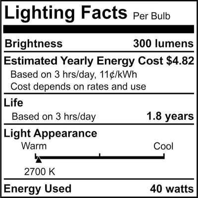 - This box includes a pack of 50, 40 watts bulbs. Each incandescent bulb has 300 lumens, 100 CRI, and 2700K. Each bulb is an E26 medium, standard screw base. The maximum overall length of each bulb 3.875 inches and the bulb diameter is 1.25 inches.