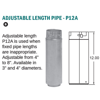 Adjustable length P12A is used when fixed pipe lengths are inappropriate. Adjustable from 4" to 8". Available in 3" and 4" diameters. For use with biomass fuels such as pellet, corn, wheat or other grassy and woody plants as specified by appliance manufacturers.