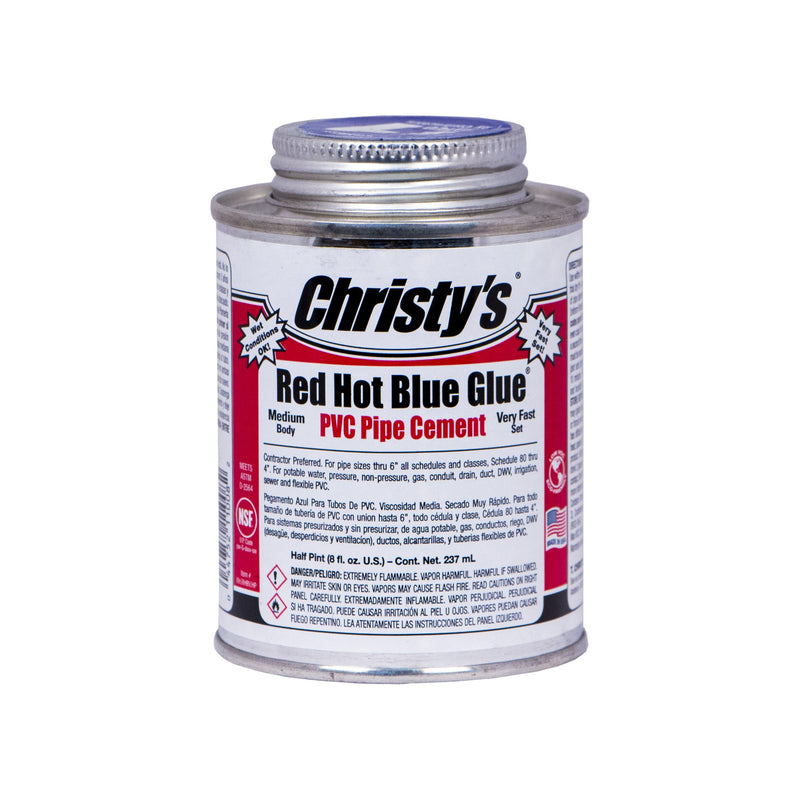 Christy's RED HOT BLUE GLUE is a very aggressive, deep blue, medium bodied, very fast setting PVC solvent cement for all classes and schedules. Christy's Red Hot Blue Glue is the industry's highest quality Blue Glue, from the leading producer of high-performance solvent cements. For use in plumbing, industrial, irrigation, agricultural, municipal, or pool and spa applications including PVC foam core.
