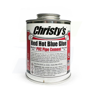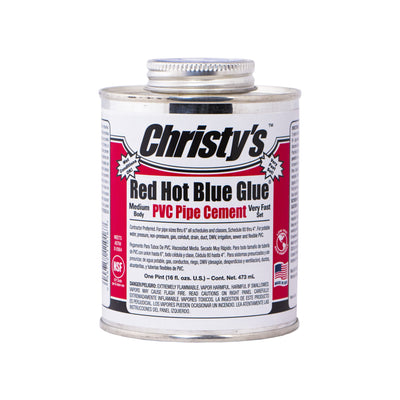 Christy's RED HOT BLUE GLUE is a very aggressive, deep blue, medium bodied, very fast setting PVC solvent cement for all classes and schedules. Christy's Red Hot Blue Glue is the industry's highest quality Blue Glue, from the leading producer of high-performance solvent cements. For use in plumbing, industrial, irrigation, agricultural, municipal, or pool and spa applications including PVC foam core.