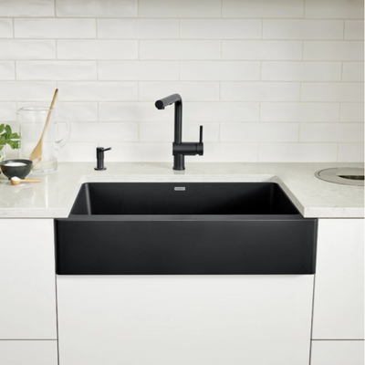 The VINTERA 30 kitchen sink provides a slim 6 1/2-inch apron and a generous 9-inch bowl depth. The VINTERA is a contemporary version of the farmhouse sink style with versatile installation capabilities, allowing for a unique flush mount placement. The VINTERA 30 fits into a standard base cabinet measuring 30 inches - the same width as the sink. This eliminates the need for custom cabinetry common with farmhouse sinks, making kitchen renovations easier. Made of BLANCO’s patented SILGRANIT composite material, VINTERA sinks are engineered to withstand heavy cookware and hot bakeware. Strong and beautiful, Silgranit sinks are available in a range of nature-inspired colors that effortlessly complement the latest kitchen trends. Combine the VINTERA 30" sink with a BLANCO faucet and accessories to create a BLANCO UNIT; a seamless, fully integrated kitchen solution designed to transform kitchen chores into joyful experiences.