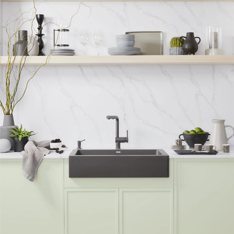 The VINTERA 30 kitchen sink provides a slim 6 1/2-inch apron and a generous 9-inch bowl depth. The VINTERA is a contemporary version of the farmhouse sink style with versatile installation capabilities, allowing for a unique flush mount placement. The VINTERA 30 fits into a standard base cabinet measuring 30 inches - the same width as the sink. This eliminates the need for custom cabinetry common with farmhouse sinks, making kitchen renovations easier. Made of BLANCO’s patented SILGRANIT composite material, VINTERA sinks are engineered to withstand heavy cookware and hot bakeware. Strong and beautiful, Silgranit sinks are available in a range of nature-inspired colors that effortlessly complement the latest kitchen trends. Combine the VINTERA 30" sink with a BLANCO faucet and accessories to create a BLANCO UNIT; a seamless, fully integrated kitchen solution designed to transform kitchen chores into joyful experiences.