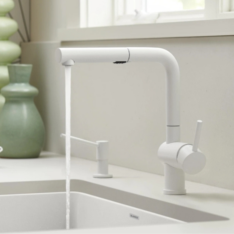 A beautifully designed kitchen deserves an equally beautiful faucet. The LINUS Low-Arc Pull-Out Kitchen Faucet features a sleek, low-profile design, perfect for contemporary kitchen designs or kitchen workspaces with upper cabinets that have limited overhead clearance. Exclusive to BLANCO, the LINUS features color-coordinated finishes to match beautifully with the full spectrum of SILGRANIT sink colors. Matching your kitchen sink with a color-coordinated faucet allows you to breathe new life into your kitchen without having a costly remodel. The bold, angular design of the LINUS will make your kitchen workspace stand out from the rest.