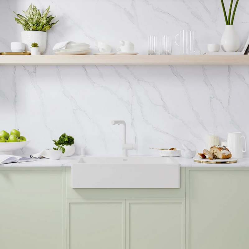 The VINTERA 30 kitchen sink provides a slim 6 1/2-inch apron and a generous 9-inch bowl depth. The VINTERA is a contemporary version of the farmhouse sink style with versatile installation capabilities, allowing for a unique flush mount placement. The VINTERA 30 fits into a standard base cabinet measuring 30 inches - the same width as the sink. This eliminates the need for custom cabinetry common with farmhouse sinks, making kitchen renovations easier. Made of BLANCO’s patented SILGRANIT composite material, VINTERA sinks are engineered to withstand heavy cookware and hot bakeware. Strong and beautiful, Silgranit sinks are available in a range of nature-inspired colors that effortlessly complement the latest kitchen trends. Combine the VINTERA 30" sink with a BLANCO faucet and accessories to create a BLANCO UNIT; a seamless, fully integrated kitchen solution designed to transform kitchen chores into joyful experiences.